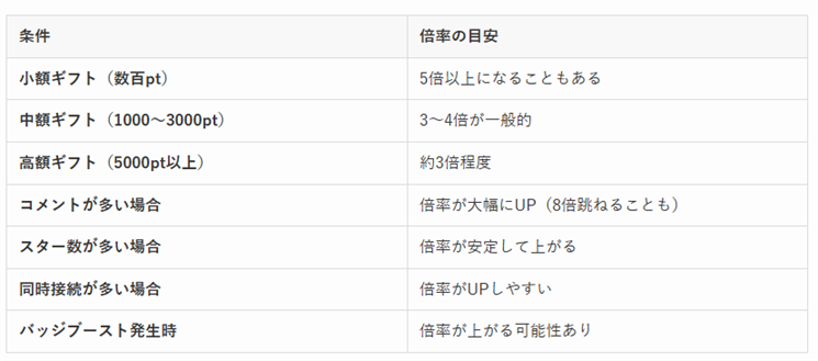 ✅ ギフト単体で投げるより、コメントを増やしてから投げる方が倍率が上がる!