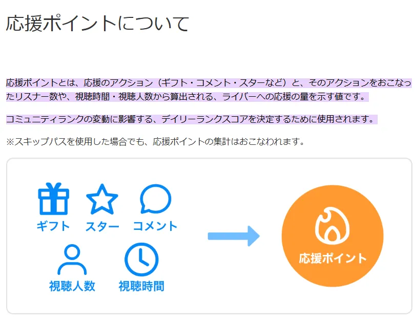 応援ポイントは、以下の要素によって加算される。
